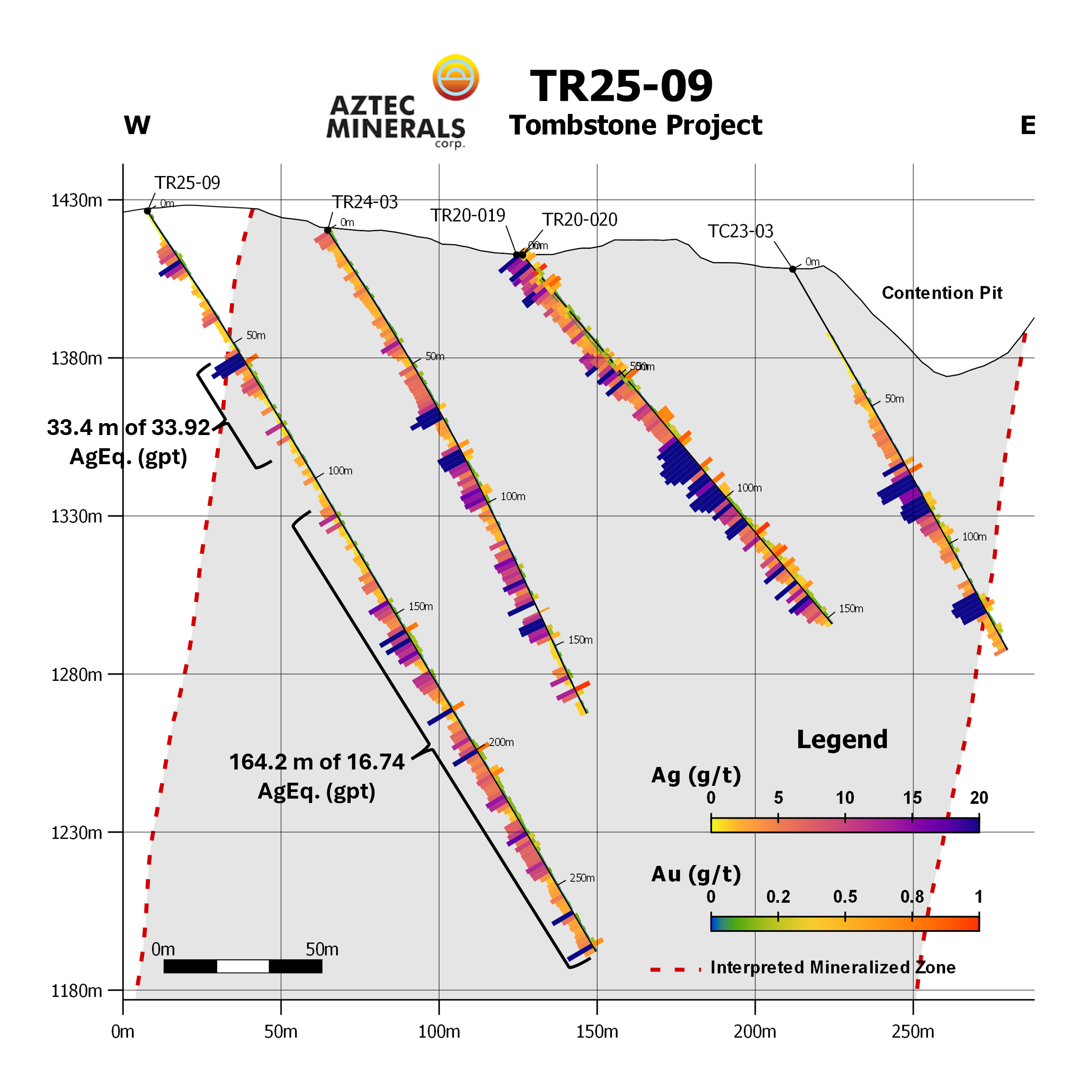 - Hole TR25-9 - Was collared from the western side of the Contention Target easterly across and to depth 273.6 m the main Contention area. It was designed to test continuity of the mineralization on the western side and below other, prior RC drillholes. It intersected three zones of Ag-Au mineralization with it bottoming in 164.2 m of 16.74 gpt AgEq (0.014 gpt Au, 7.31 gpt Ag). Over 76% of the drillhole’s length was composed of mineralized intersections. The drillhole leaves the mineralization open to the west and to depth. Drilling was stopped due to hole stability. The interval is composed of siliciously and argillically altered, lower Bisbee group fine-grained sandstones/quartzites, siltstones/hornfels and limestones cut by hydrothermal breccias, quartz-feldspar porphyry dikes, and faults/fissures with quartz veining. Moderate to strong iron oxides, manganese oxides, orange to red color, and oxidized pyrite sites.