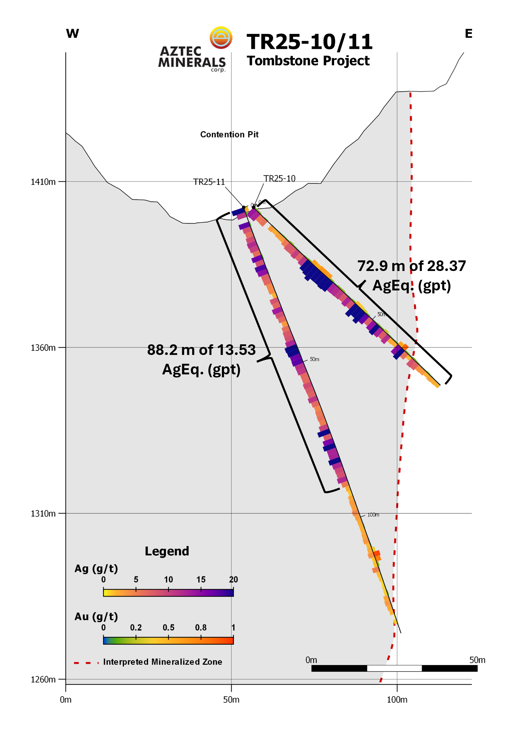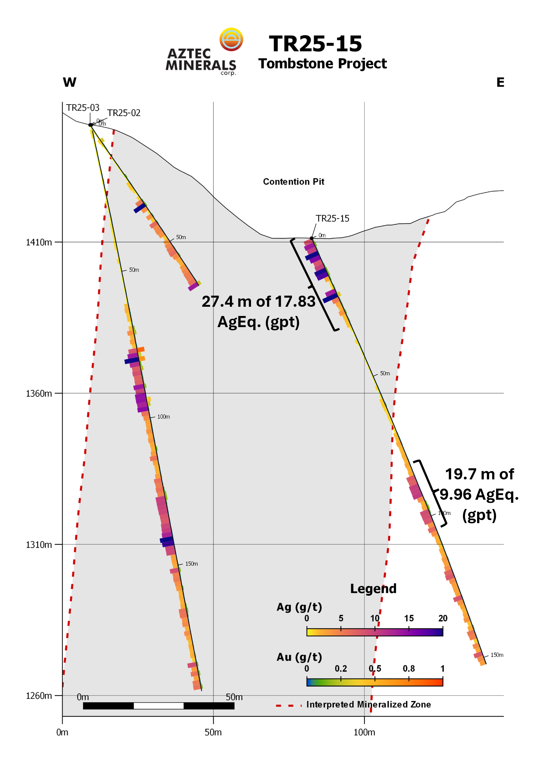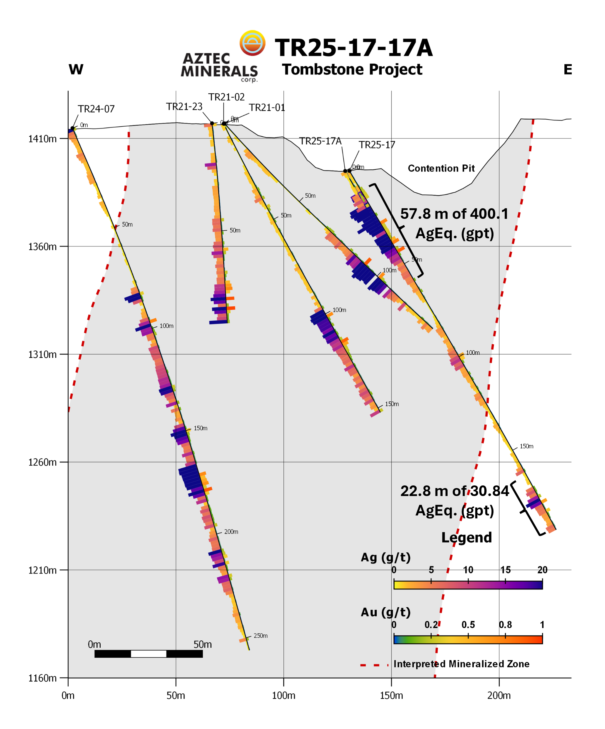 Aztec also reports the final multi-acid digestion analytical (“MA”) results from the previously reported initial fire assay analytical (“FA”) results from TR25-16/17/17a that tested the previously undrilled Head Center Area in the northern Contention Target (please see news release dated November 4, 2025). Final analytical results from TR25-17 returned a broad zone of 57.8m averaging 5.16 gpt Au and 39.1 gpt Ag including 4.56m of 58.5 gpt Au and 173.1 gpt Ag. TR25-17A returned 80.95 gpt AgEq and 1.00 gpt Au over 10.6m ending in a 7.6m open stope.