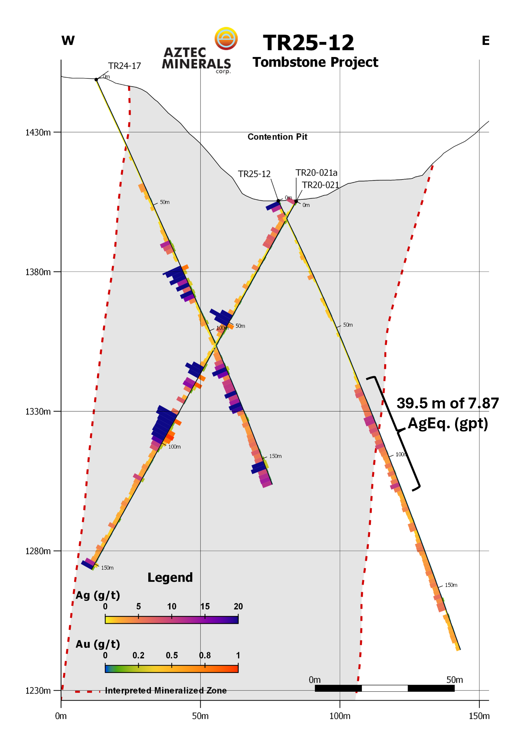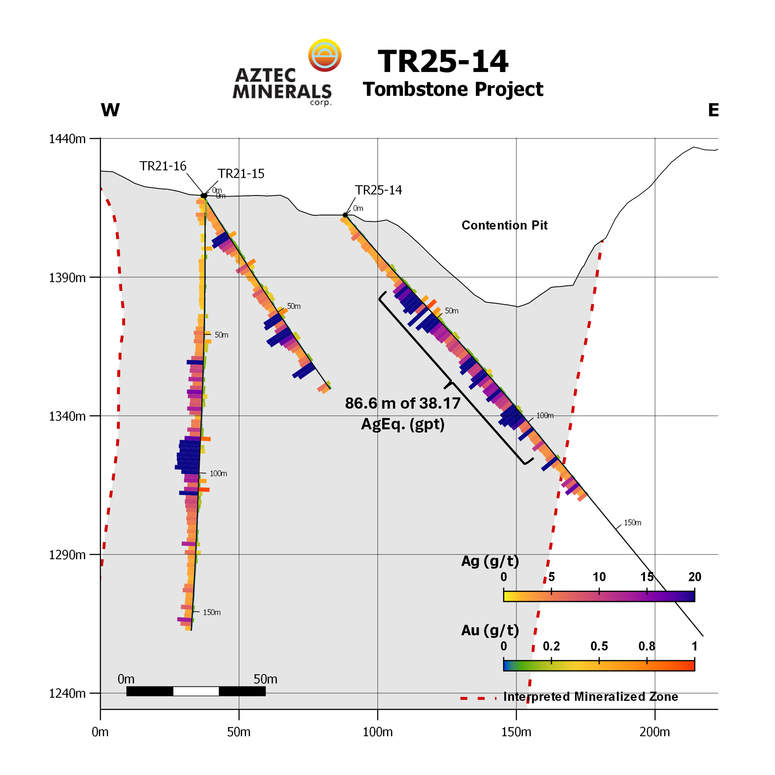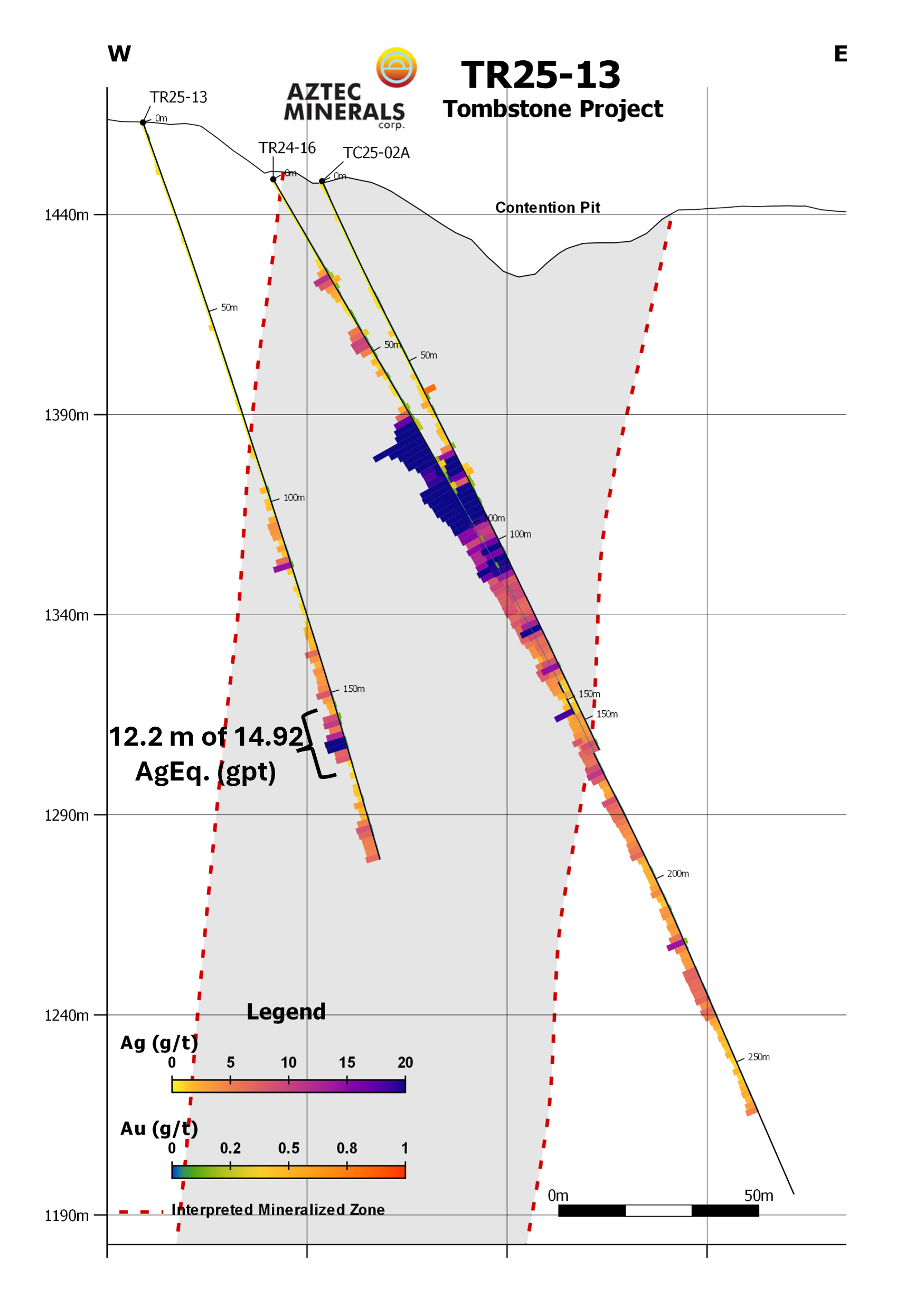 Aztec also reports the final multi-acid digestion analytical (“MA”) results from the previously reported initial fire assay analytical (“FA”) results from TR25-16/17/17a that tested the previously undrilled Head Center Area in the northern Contention Target (please see news release dated November 4, 2025). Final analytical results from TR25-17 returned a broad zone of 57.8m averaging 5.16 gpt Au and 39.1 gpt Ag including 4.56m of 58.5 gpt Au and 173.1 gpt Ag. TR25-17A returned 80.95 gpt AgEq and 1.00 gpt Au over 10.6m ending in a 7.6m open stope.