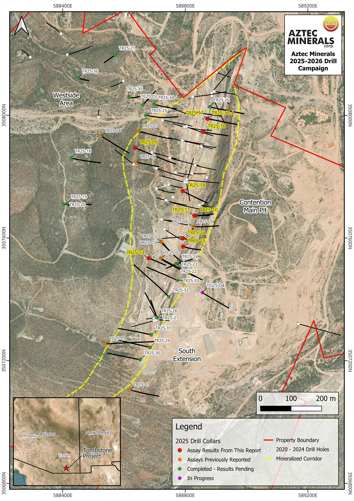 Vancouver, Canada – January 7, 2026 - Aztec Minerals Corp. (AZT: TSX-V, OTCQB: AZZTF) (“Aztec” or the “Company”) announces it has received the results from an additional seven RC drill holes, as well as final multi-acid digestion analytical (“MA”) results from the previously reported preliminary fire assay analytical (“FA”) results from TR25-16/17/17a of its reverse circulation portion of the 2025 drilling program at the Tombstone Property in Southeastern Arizona. The 2025 drilling program has now completed 40 RC drill holes and one core hole as of December 31, 2025, with results from the 7 RC holes drilled in the historic Contention Mine Area of the Contention Target announced herein.